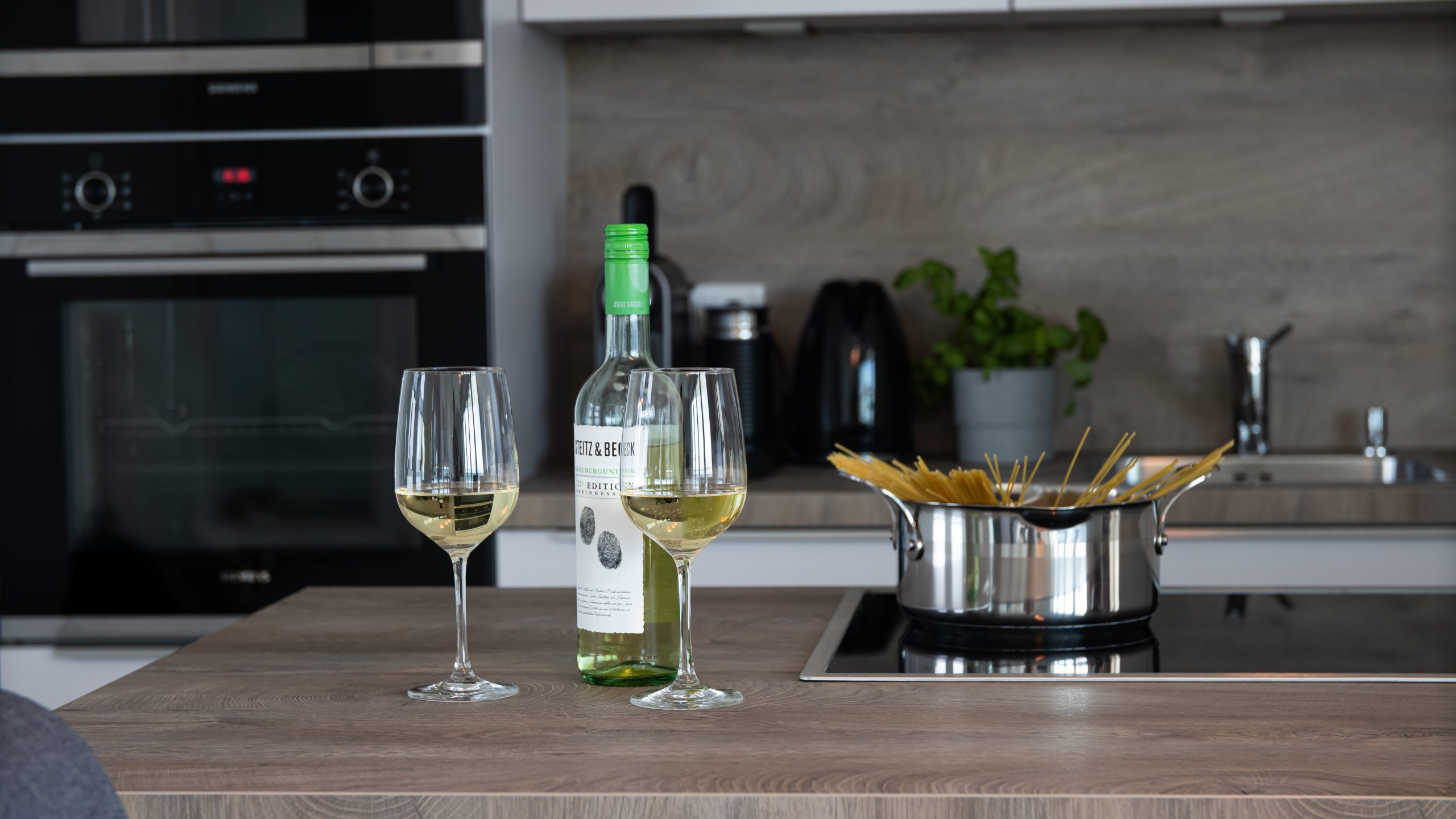 Verbunden werden beide Schlafzimmer durch den Wohn-/Essbereich mit offener, voll ausgestatteter Küche und separatem Badezimmer. Solltet Ihr zu fünft oder zu sechst reisen, kann das Sofa zum Nachtlager für bis zu zwei Personen umfunktioniert werden.