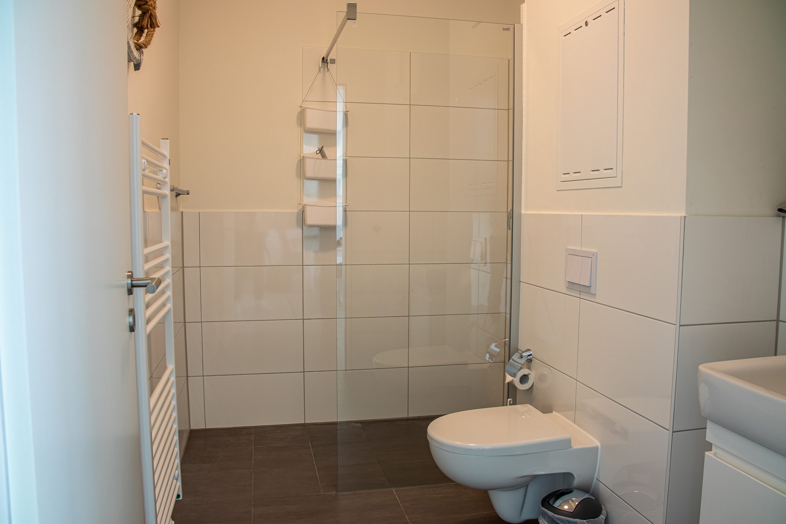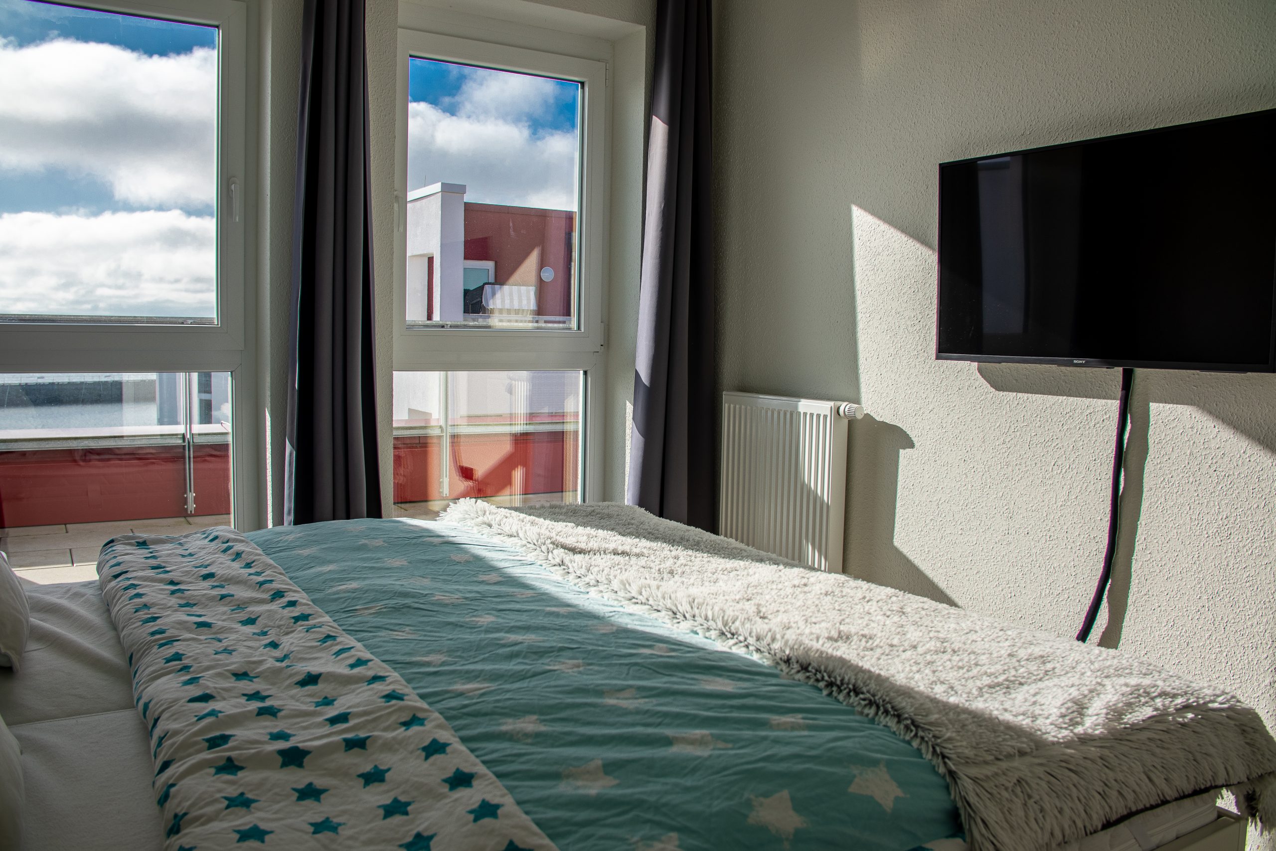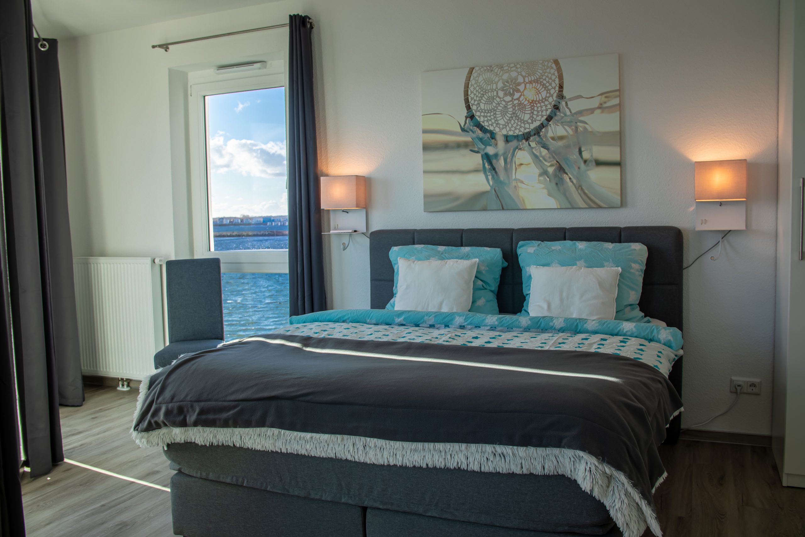Vom ersten Schlafzimmer kannst Du zudem den Hafen von Olpenitz erblicken. Dieses Zimmer verfügt über ein 1,60 Meter großes Boxspringbett, sowie über ein hochwertiges En-Suite-Badezimmer mit WC und bodengleicher Dusche.