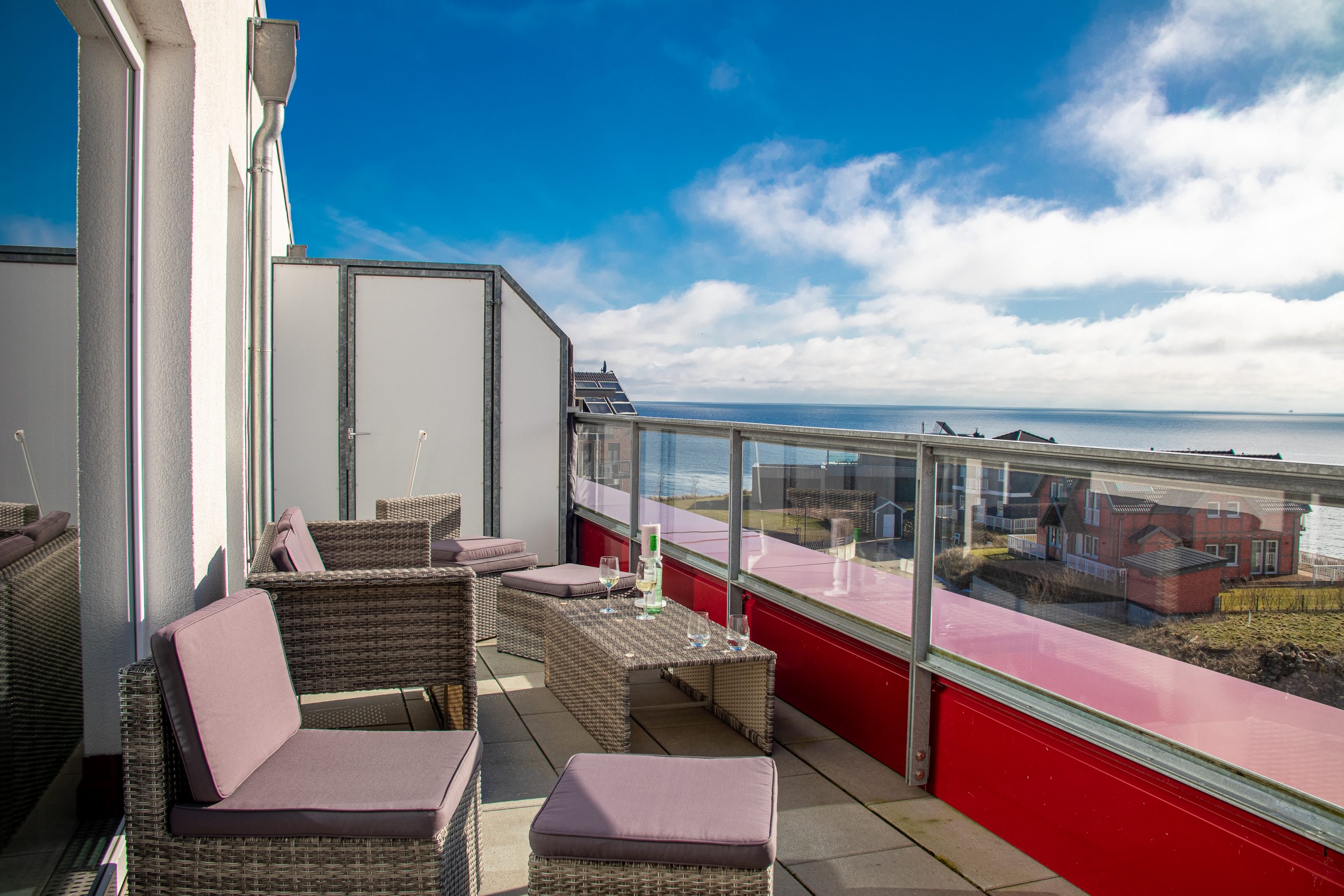 Tanke Sonne, Frischluft und Energie auf der privaten 25 Quadratmeter großen Dachterrasse mit Südwestausrichtung und genieße den wunderschönen Ostseeblick bei Sonnenuntergang.